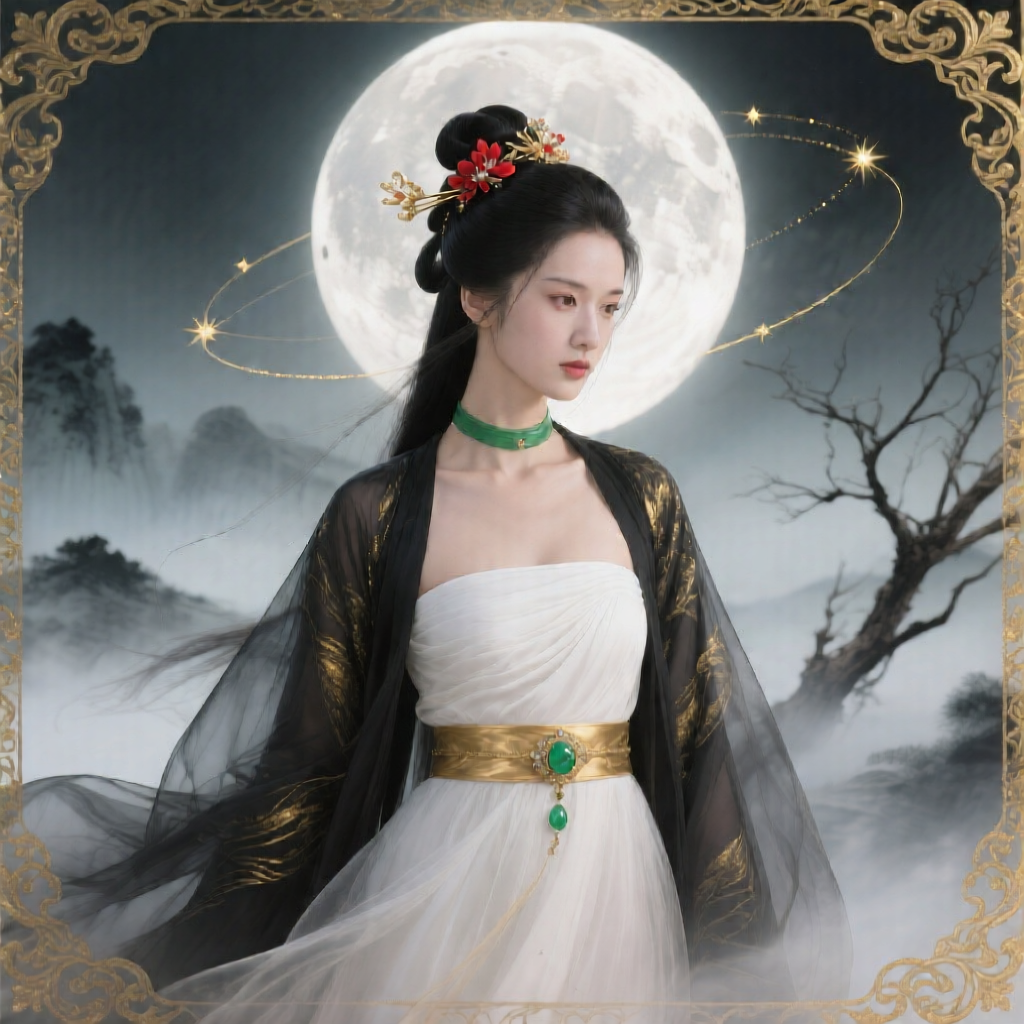 | 国风 | 细腻国风唯美插画,8K 分辨率,古风仙侠女子:乌黑盘发搭配红蕊发饰与鎏金发簪,翡翠项圈衬得脖颈纤细,白衣抹胸裙外覆黑纱金纹广袖外袍(轻纱随隐微风漾起褶皱),腰间金带嵌翡翠饰坠;背景是晕染开的淡墨山水、枯枝斜伸,巨型圆月悬于身后(环绕细金星轨),画面边缘饰鎏金缠枝纹边框;光影柔缓朦胧,皮肤通透带自然光泽,衣物轻纱质感轻盈飘逸,整体氛围空灵雅致,国风古韵浓厚 | ![]() |
